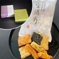 海苔羽衣、黒糖かりん、白双付(ざらめ)、玄米揚げ醤油、玄米揚げ塩、アオサあられ、甘辛落花の7つの味を一包みにおさめた、みやびにして豊かな味の名品です。