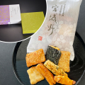 海苔羽衣、黒糖かりん、白双付(ざらめ)、玄米揚げ醤油、玄米揚げ塩、アオサあられ、甘辛落花の7つの味を一包みにおさめた、みやびにして豊かな味の名品です。