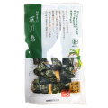 江戸は東京下町深川の精華堂があられが隠れるくらい、海苔を大きめに気風よく作ったのが深川巻きです。昆布・かつお節を煮出した「だし」入り国産有機醤油を二度づけして、一本づつ心を込めて巻いています。江戸下町の心意気をご堪能ください。