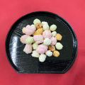 お口直しの茶色のあられはカツオと昆布の特製だし醤油で味付けしました。